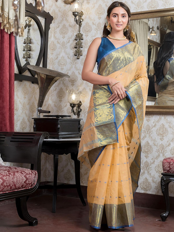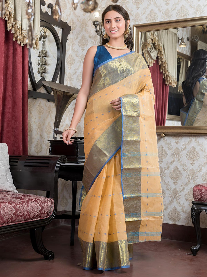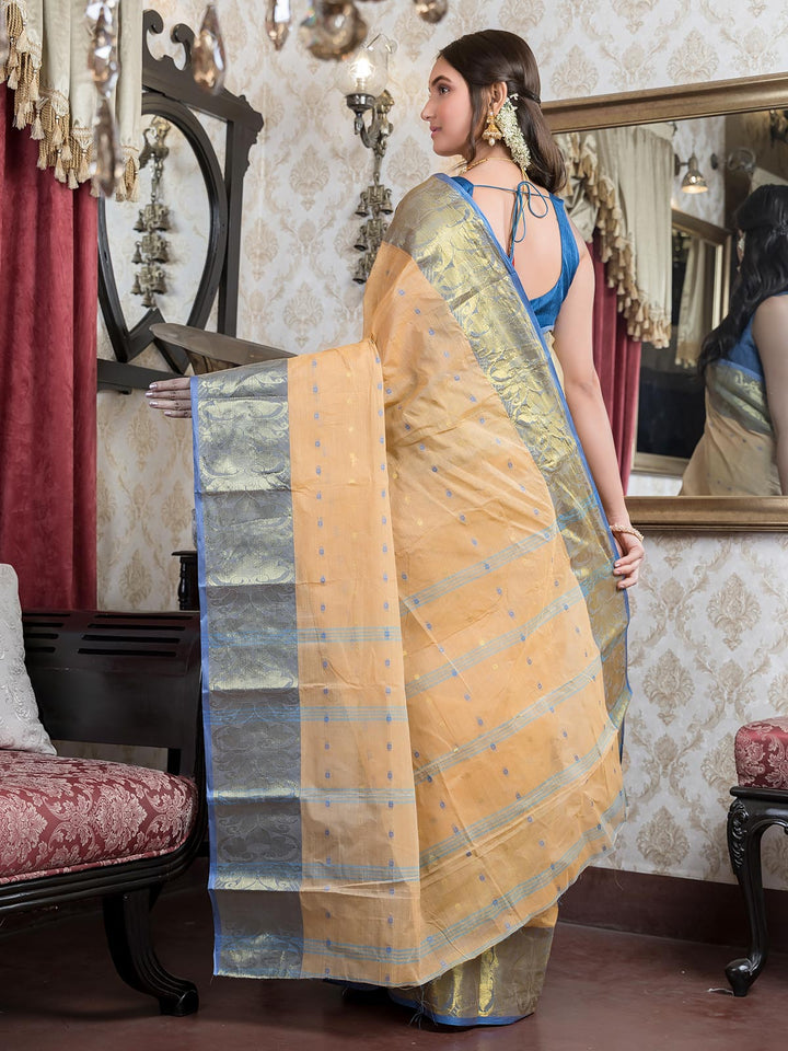 Bengal Cotton Handloom Saree or Tant sarees are one of the most loved sarees in India. Tant sarees are distinguished by their lightness and translucency. This saree is adorned with zariwork border and all over butis or micro-size motifs called hazar buti.