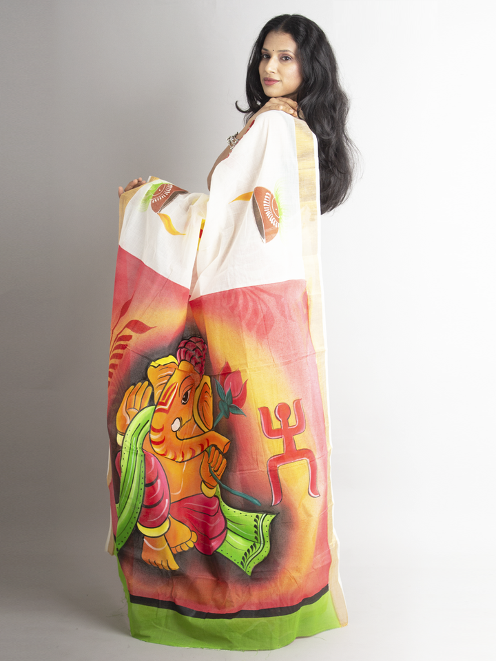 This Kerala Cotton Hand Painted Saree with Zari Border is considered an ideal addition to any wardrobe. Its hand painting decoration is characterized by vibrant colors and intricate designs. This pure cotton handloom saree is suitable for any occasion with a traditional touch. The pallu is adorned with a unique, hand-painted image, adding an exotic flair to the saree. The saree is with colorful hand painting and a broad zari border. Its fabric is 100% pure cotton.