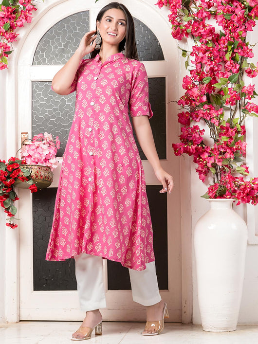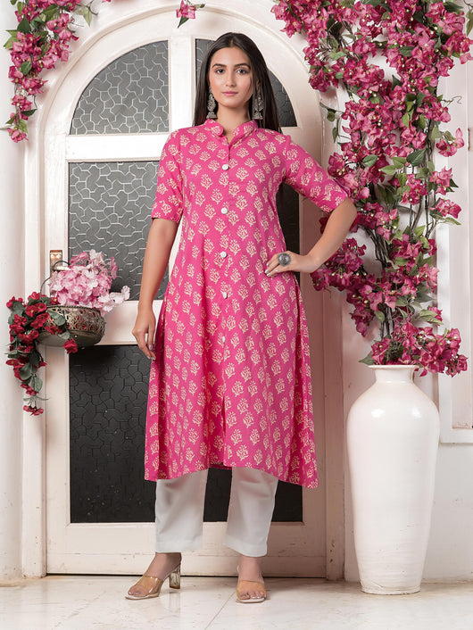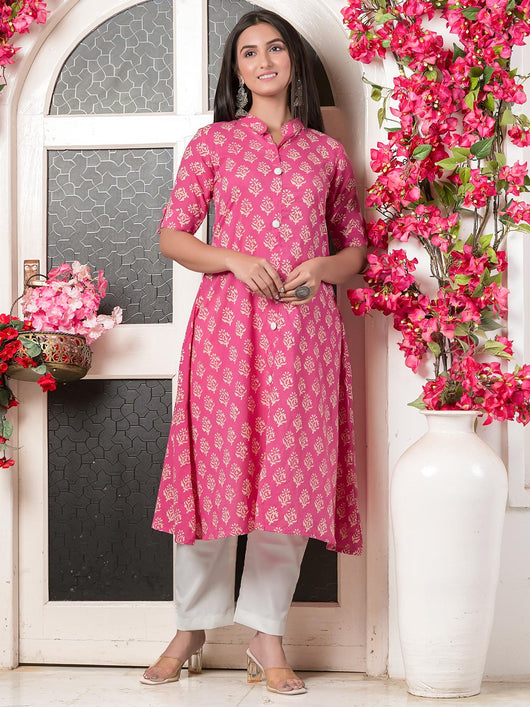 This kurta set, crafted from 100% pure cotton, combines comfort with style. The pink kurta is beautifully decorated with white dabu print motifs, while the bottom showcases charming off white. The elegant white pattern on the kurta adds a touch of sophistication, making it a perfect choice for any occasion.