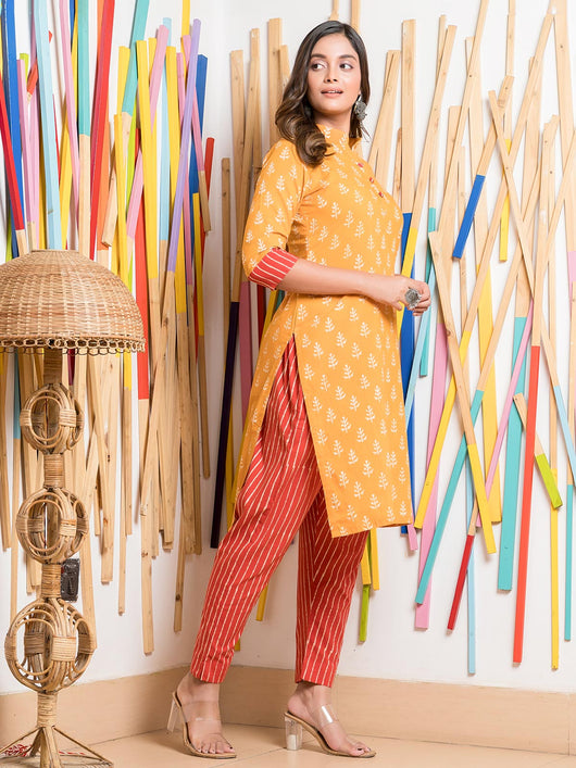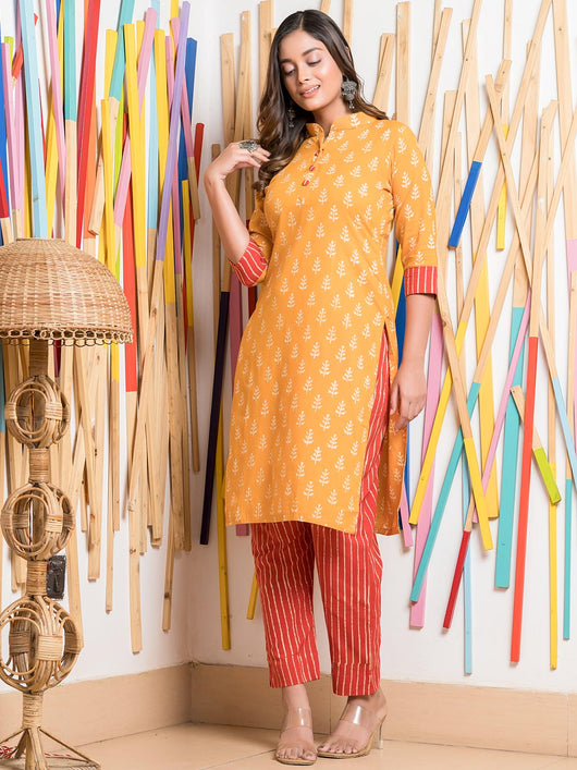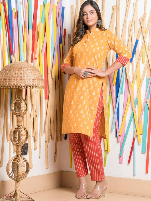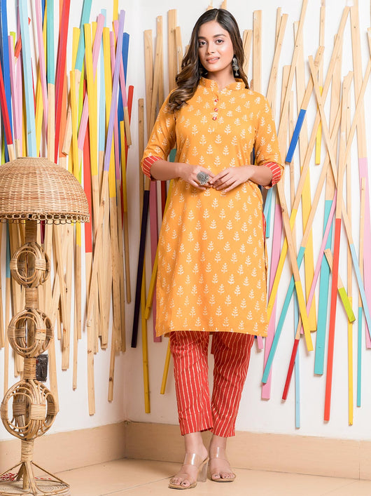 This kurta set, crafted from 100% pure cotton, combines comfort with style. The ochre yellow kurta is beautifully decorated with white dabu print motifs, while the bottom showcases charming dark orange with white motifs. The elegant white pattern on the kurta adds a touch of sophistication, making it a perfect choice for any occasion.
