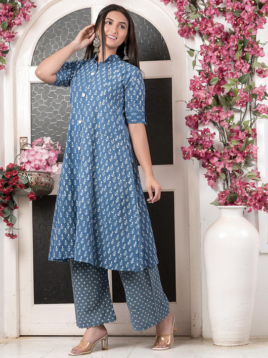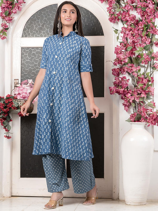 This kurta set, crafted from 100% pure cotton, combines comfort with style. The blue kurta is beautifully decorated with white dabu print motifs, while the bottom showcases charming bluish grey with white polka dots. The elegant white pattern on the kurta adds a touch of sophistication, making it a perfect choice for any occasion.