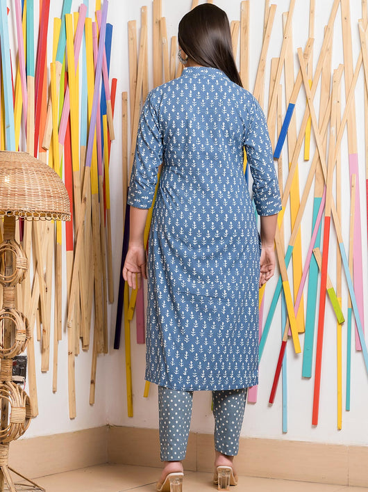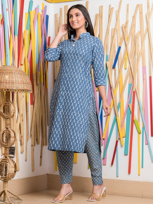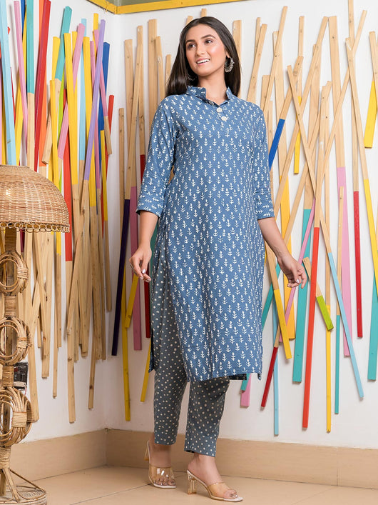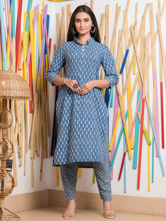 This kurta set, crafted from 100% pure cotton, combines comfort with style. The blue kurta is beautifully decorated with white dabu print motifs, while the bottom showcases charming buish grey with white polka dots. The elegant white pattern on the kurta adds a touch of sophistication, making it a perfect choice for any occasion.